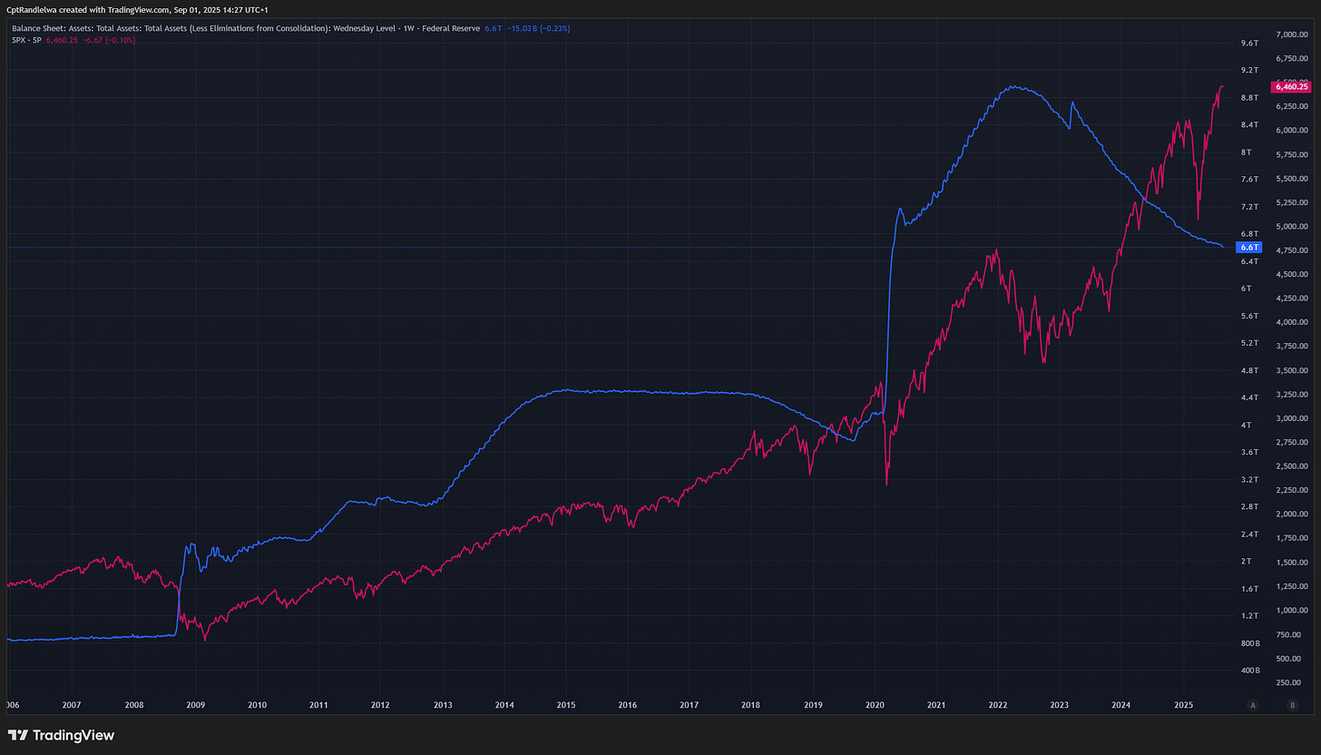 While fiscal deficits have been a tailwind, monetary policy has been a counterweight. The Fed is shrinking its balance sheet through quantitative tightening (QT), pulling reserves out of the system. In past cycles, QT was enough to destabilize markets. This time, fiscal deficits are offsetting QT, creating a tug-of-war between monetary withdrawal and fiscal injection.